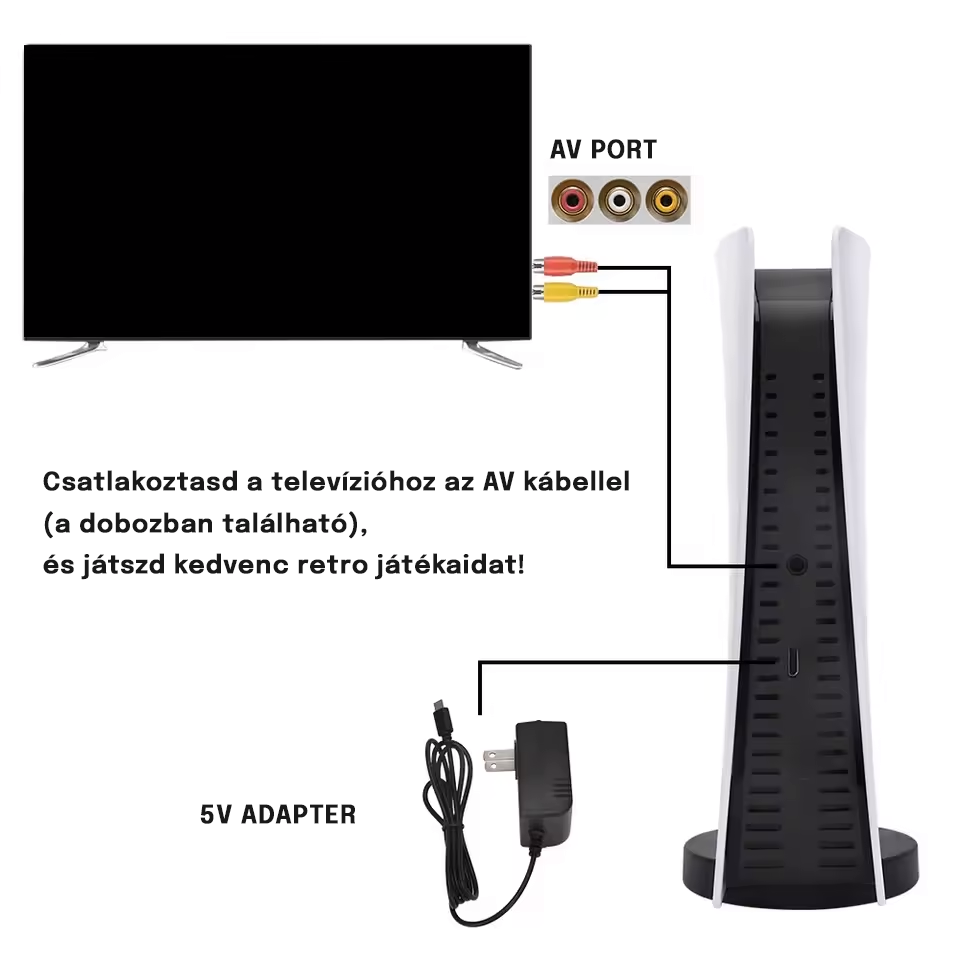Kösd össze a konzolt a TV-vel AV kábelen keresztül, és élvezd a nosztalgikus játékokat nagy képernyőn, élénk grafikával és zökkenőmentes játékmenettel!